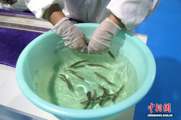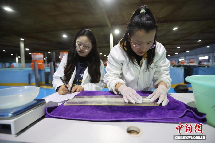 4月14日,青海西宁,青海湖裸鲤救护重心任务职员正正在抽样丈量养殖的裸鲤。中新社记者 弛忠苹 摄